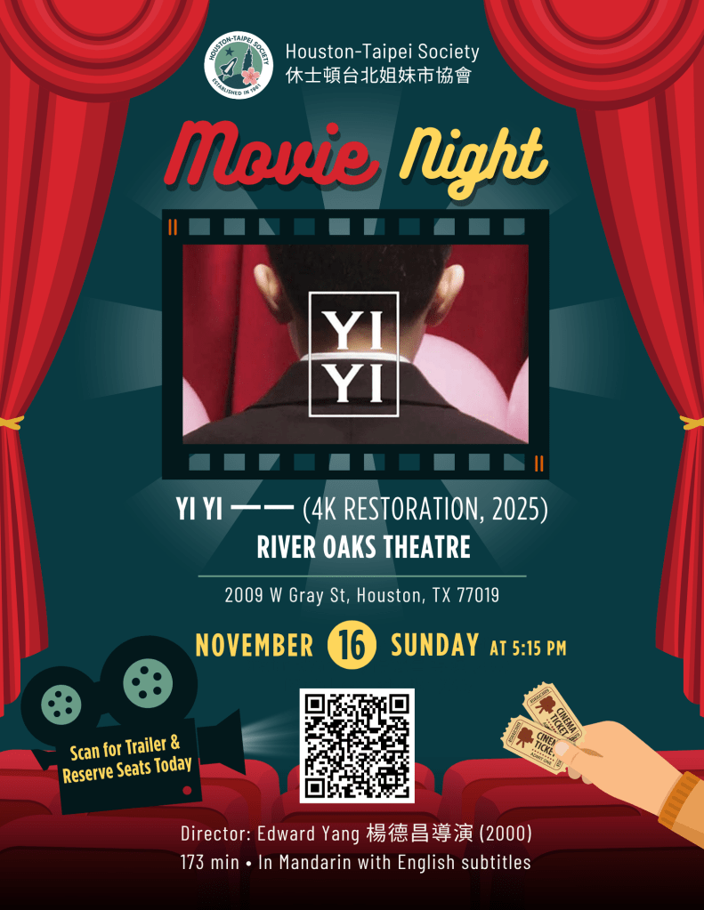 Join the Houston-Taipei Society at River Oaks Theatre on November 16, 2025 for a special screening of Edward Yang’s internationally acclaimed masterpiece Yi Yi.