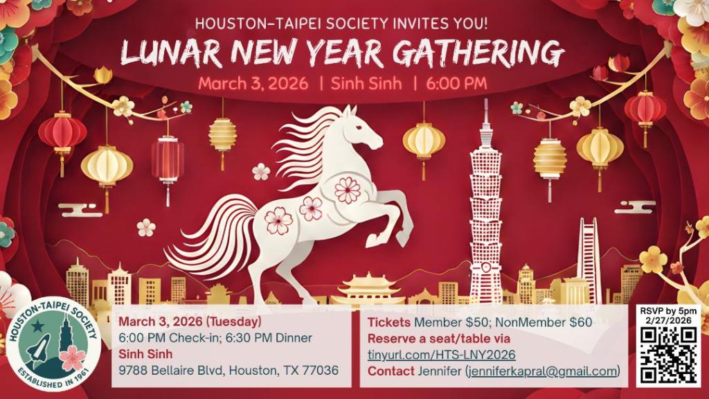 Kick off the Year of the House with an evening of delicious Chinese cuisine, blessings exchange and great company! The Houston-Taipei Society will be celebrating 65 years of the sister city relationship between Houston and Taipei, Taiwan. Come out and visit with old friends and make new ones – we will also be sharing our exciting 2026 events roadmap.